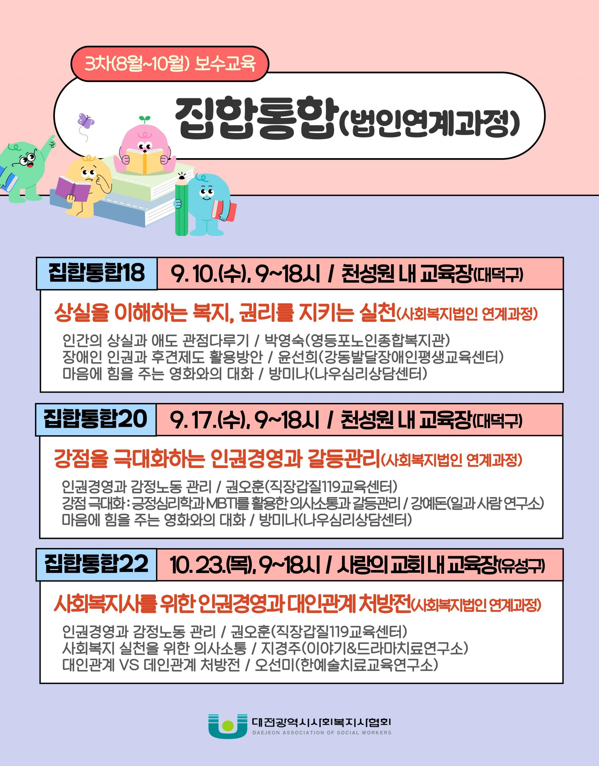 - 보수교육센터(www.welfare.net/edu/) → 개인회원 로그인→ 보수교육 → 실시기관 ‘대전광역시사회복지사협회’ 설정 후 검색 → 수강신청 → 교육비 결제(※교육비 결제가 확인되어야 신청 완료)